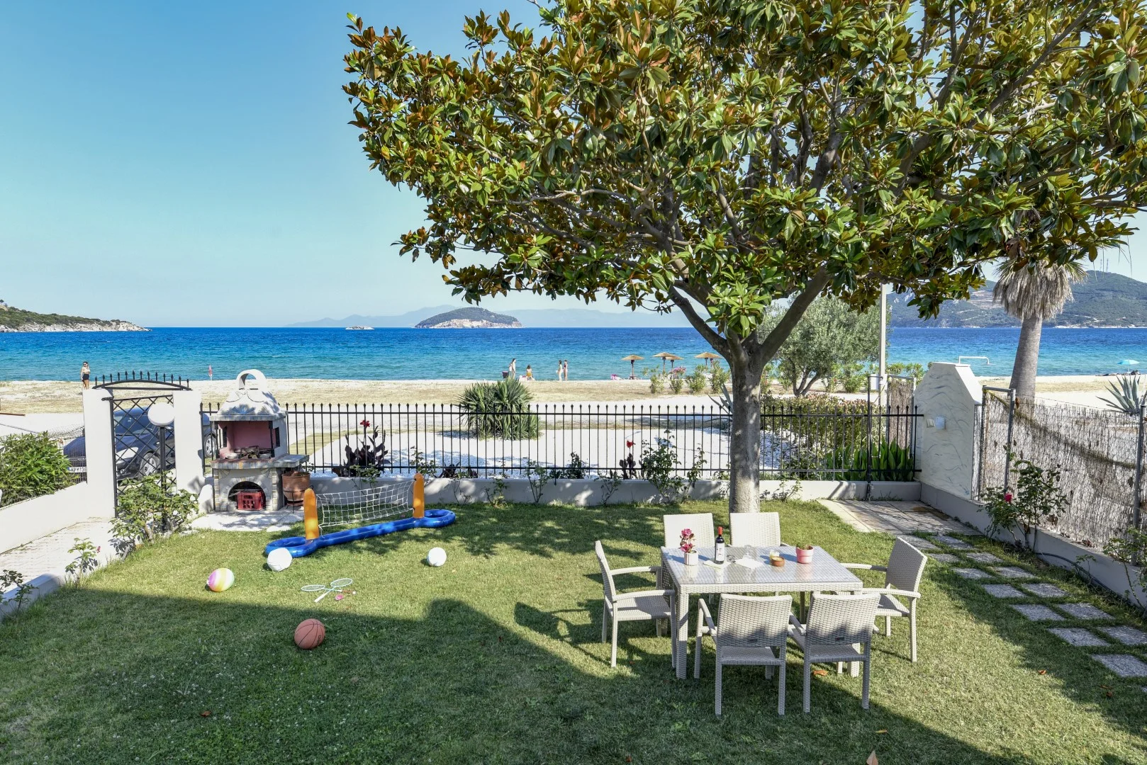 Spacious green garden for adults to rest and relax and plenty of play for children with balls, inflatables and many other toys. The garden has a barbecue which can be used as well as an outdoor shower for after swimming in the sea. It also has fencing for the most carefree relaxation of the adults while the children enjoy their game.
